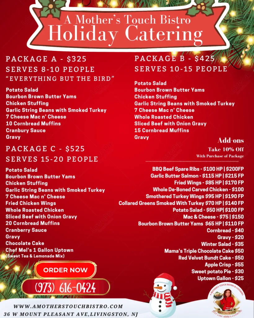 At A Mother’s Touch Bistro & Catering, we’re all about bringing the rich flavors of Jamaica, soul food, and Louisiana Creole cooking to Livingston, NJ. Every dish we serve is made with fresh, high-quality ingredients and a generous dash of love. Whether you’re stopping by for a quick meal or ordering catering for a big event, you’ll always find the warmth and comfort of home cooking here.